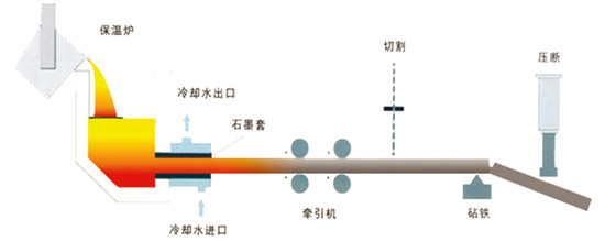 水平連鑄鑄鐵型材的制作方法是將嚴(yán)格選擇的原輔料經(jīng)沖天爐或感應(yīng)爐熔化處理后的鐵水,倒入保溫爐內(nèi),鐵水流入安裝在保溫爐下方的水冷石墨結(jié)晶器中,凝結(jié)成一定溫度的外殼,被牽引機(jī)拉拔成型材。保溫爐內(nèi)的熔融鐵水, 在牽引機(jī)拉拔的同時(shí),又不斷地補(bǔ)充倒結(jié)晶器內(nèi)冷卻凝固,形成了一個(gè)動(dòng)態(tài)的大胃口補(bǔ)縮小鑄件的工藝模式,保證了所產(chǎn)棒坯致密,無(wú)內(nèi)部缺陷。不同形狀的結(jié)晶和不同的生產(chǎn)工藝,可以生產(chǎn)不同截面,不同材質(zhì)的鑄鐵型材。